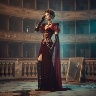 Concept fashion model set within Theme Environment Mood. Three-quarter full-body pose, slight contrapposto, weight on rear leg, chin angled toward the key light; poised, confident expression. Outfit: Outfit Style with couture finishing-precise tailoring, layered textiles, tactile surfaces (satin vs. matte), statement accessories that echo the theme; bespoke embellishments, structured silhouette, refined drape and movement. Hair and makeup complement the concept; subtle narrative prop elements.