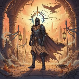 , ornate motifs, and faint arcane sigils. Dramatic lighting: warm golden backlight with cool ambient fill; volumetric god rays, drifting motes, gentle light bloom; low mist for depth. Color palette: warm highlights against cool shadows, with a few saturated accent hues that echo the theme. High detail and texture: crisp edges on the subject, layered glazing, subtle surface grain, shallow depth of field, atmospheric perspective, and a soft vignette.