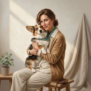 Three-quarter, eye-level framing with subtle rule-of-thirds; portrait orientation. Soft, directional key light from 45° with gentle rim light; calm, airy atmosphere and shallow depth of field. Balanced warm-to-neutral palette with a complementary accent from clothing or collar; moderate saturation. Highly detailed yet clean rendering-crisp eyes, natural skin and fur texture, smooth background bokeh, refined edges, seamless photo-to-art blend.