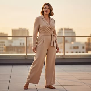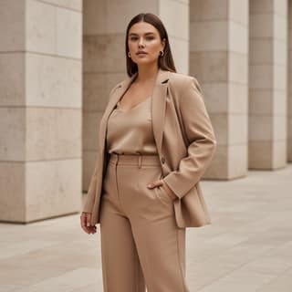 Create a respectful, size-inclusive fashion photograph of a confident plus-size model wearing Outfit Type in a Style Vibe aesthetic, set in a Environment setting. Three-quarter to full-body, eye-level, centered with clean negative space; subtle S-curve stance, weight on one leg, relaxed shoulders; natural skin texture and authentic proportions; understated hair and makeup, garment well-fitted and neatly styled.
