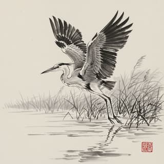 interpreted in expressive ink‑brush calligraphic style. Flowing, sweeping strokes with clear pressure variation: tapered lift‑offs, bold press‑downs, speed accents; occasional dry‑brush breaks, ink pooling, and feathered edges on textured xuan/rice paper. Graphic simplicity with decisive marks and generous negative space; strong silhouette emphasized. Composition: off‑center focal strokes on the rule of thirds, dynamic diagonal flow, wide breathing margins; Aspect Ratio framing, flat straight‑on view. Technique: mostly wet‑on‑dry with selective wet‑on‑wet blooms and controlled flicks. Lighting: soft raking light from upper left to reveal paper tooth and ink sheen; quiet, airy atmosphere. Palette: deep black ink with diluted gray washes and a restrained accent of Accent Color. Highly tactile, crisp ink edges with soft bleeds.