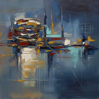 Modern abstract oil painting expressing Subject Theme, non-representational and built from layered color fields and gestural marks. Oil on linen with rich impasto: palette-knife ridges, scumbling veils, selective glazing; fine sgraffito lines revealing underpainting. Dominant palette: Color Scheme. Frontal view of the painted surface, edge-to-edge, square aspect; asymmetric balance with a focal mass on a rule-of-thirds intersection and generous negative space. Shape language and movement: