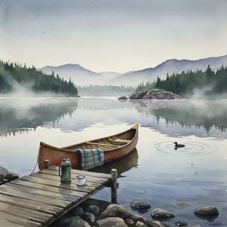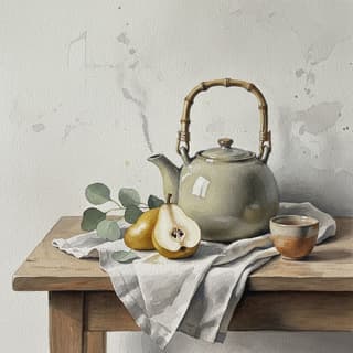 , using a heavier pigment load for a soft, matte opacity. Start with broad wet-on-wet base washes for gentle transitions; build layered opaque passes to shape forms; add selective drybrush and scumbling for tactile edges; light glazing for depth; subtle blooms and granulation. Composition: mid-distance, three-quarter view, clear focal point via rule of thirds, simplified background with generous negative space; soft vignette. Lighting: Lighting Mood with diffuse natural illumination and tender shadows. Color: Color Palette, limited and harmonious, moderately muted with balanced warm-cool interplay. Paper: cold-press tooth visible, feathered watercolor edges, minimal linework. Overall feel painterly and serene; crisp brushstroke detail while preserving watercolor softness and matte finish.