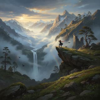 , dramatic chiaroscuro, long shadows, rim light isolating the subject. Painterly technique echoing 19th‑century Romantic aesthetics: layered glazes, expressive brushwork on clouds and terrain, softened distance. Color: rich, moody palette tuned to the emotion, warm-cool contrast, deep tonal range. Optional weather details: storm squalls, sea spray, drifting mist. Render crisp focal subject with gently softened periphery; high detail in rock, foliage, fabric.