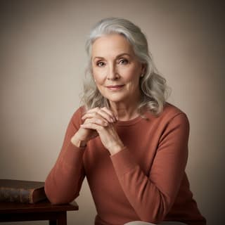 Respectful, elegant portrait of an older adult (65+) in a gentle, relaxed pose, expressing a Mood demeanor. Head-and-shoulders to half-length at eye level, subject centered with subtle rule-of-thirds placement; hands lightly folded or softly resting. Environment setting with an uncluttered backdrop and a single understated prop if fitting. Portrait orientation, 4:5; shallow depth of field, soft bokeh; crisp focus on the eyes.