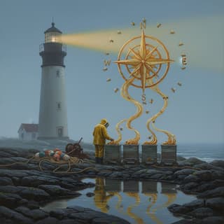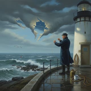 integrated believably with correct scale, cast shadows, and reflections. Composition: medium-wide view, rule-of-thirds focal point, gentle leading lines, slight low-angle perspective; one clear subject, clean silhouettes, generous negative space. Lighting: Mood Lighting; single directional key, soft bounce fill, delicate rim light; faint mist for depth. Color: limited complementary palette with warm-cool balance and restrained saturation. Finish: crisp edges at the focal area, softened periphery, hint of canvas weave, museum varnish sheen. Emphasize dreamlike calm with realistic materials and physics.